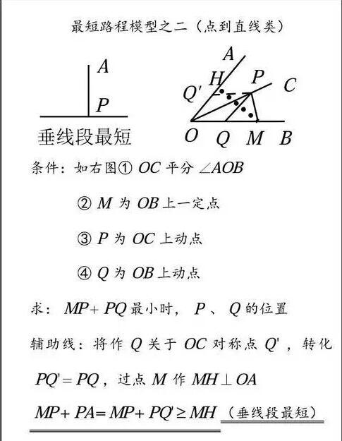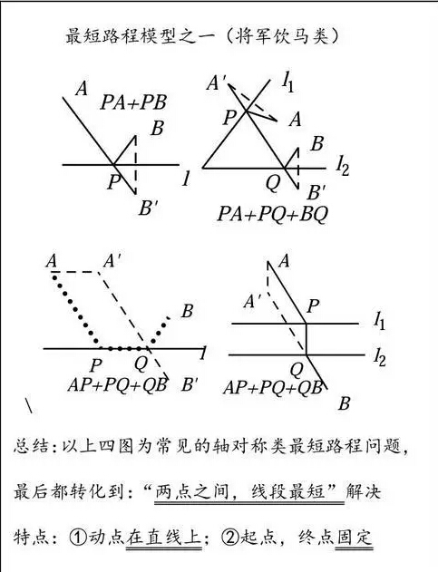 最短路線問題通常是以“平面內(nèi)連結(jié)兩點(diǎn)的線中,線段最短”為原則引申出來的。人們?cè)谏a(chǎn)、生活實(shí)踐中,常常遇到帶有某種限制條件的最近路線即最短路線問題.下面簡(jiǎn)單談一下初中數(shù)學(xué)中遇到的最短路線問題。對(duì)于數(shù)學(xué)中的最短路線問題可以分為兩大類:第一類為在同一平面內(nèi);第二類為空間幾何體中的最短路線問題,對(duì)于平面內(nèi)的最短路線問題可先畫出方案圖,然后確定最短距離及路徑圖。